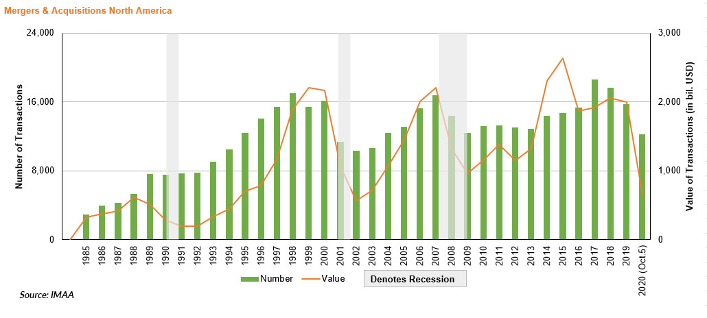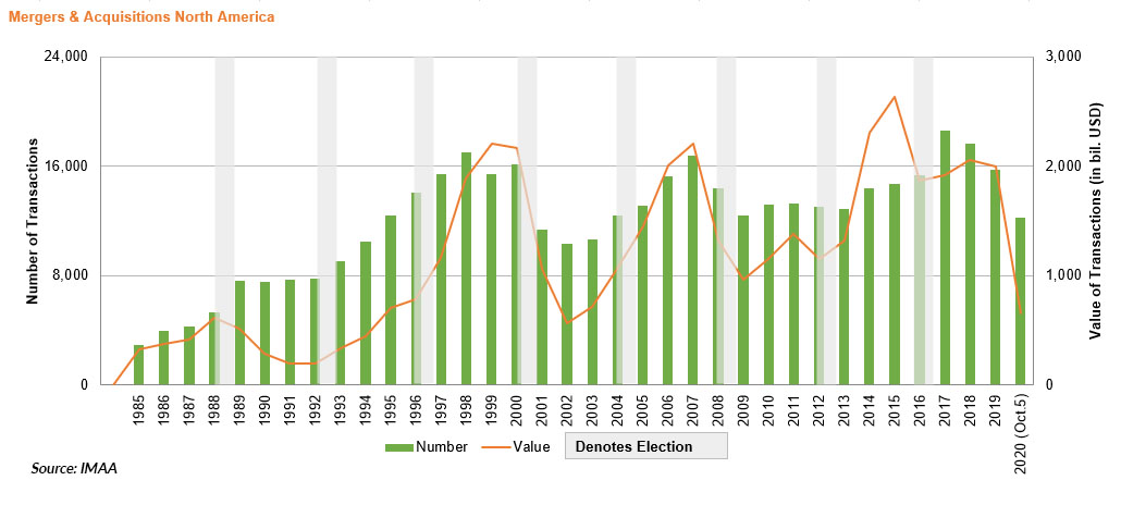 While the future remains shrouded in uncertainty, history can be used as a guide to understand where we might go from here. By looking back at some historical events since 1985—economic downturns and presidential elections—we can better understand the impact of uncertainty relative to M&A deal activity. These types of events and occurrences have varying levels of impact on mergers and acquisitions, but a statistical analysis can help us better understand what the coming months and years may hold.